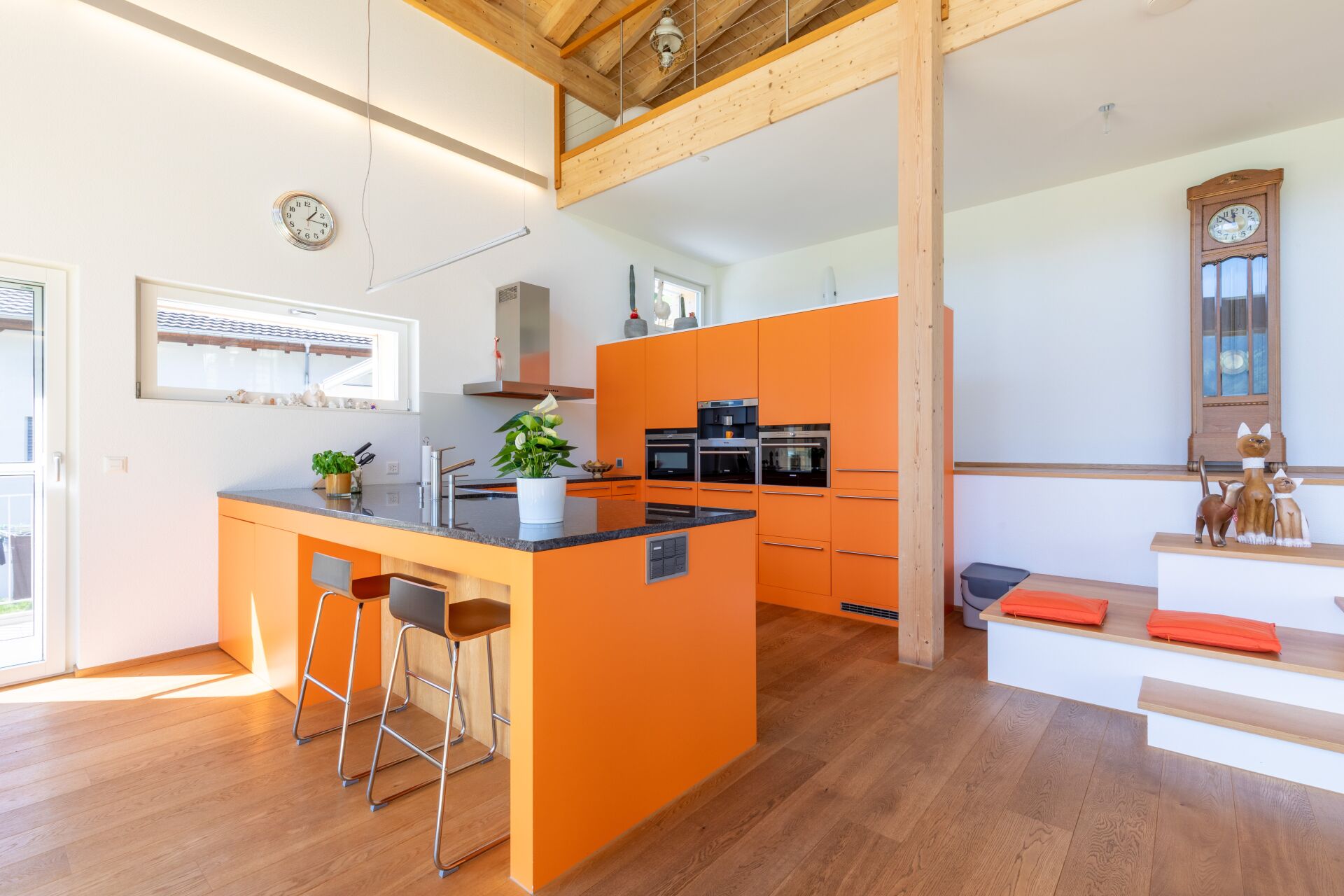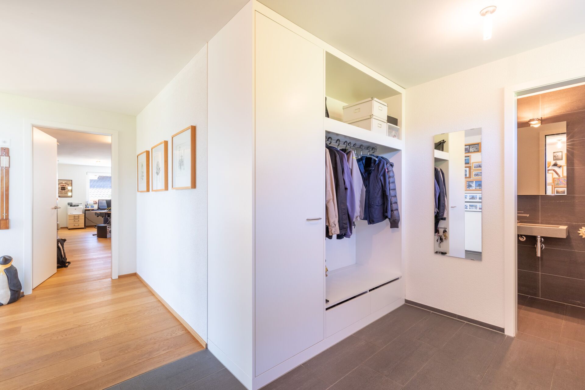 Auf der Wohnetage empfängt Sie ein einladendes Entrée mit angrenzendem Tages-WC. Der offen gestaltete Wohnbereich mit eleganter Treppe beeindruckt durch Grosszügigkeit und Licht, während die hochwertige Küche direkten Zugang zum sonnigen, südwestlich ausgerichteten Sitzplatz bietet. Ergänzt wird diese Ebene durch ein grosses, vielseitig nutzbares Zimmer, das bei Bedarf in zwei separate Räume unterteilt werden kann. Vorinstallierte Anschlüsse für eine zusätzliche Nasszelle eröffnen weitere Gestaltungsmöglichkeiten und garantieren somit maximale Flexibilität für Ihre individuellen Wohnbedürfnisse.
