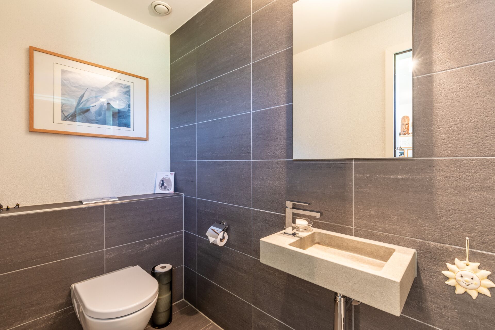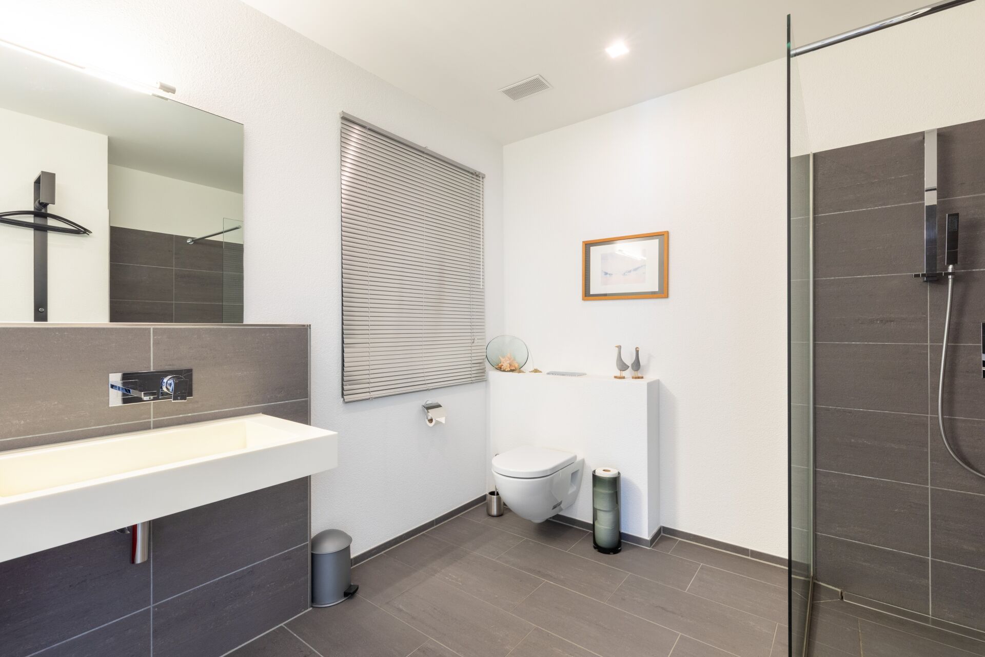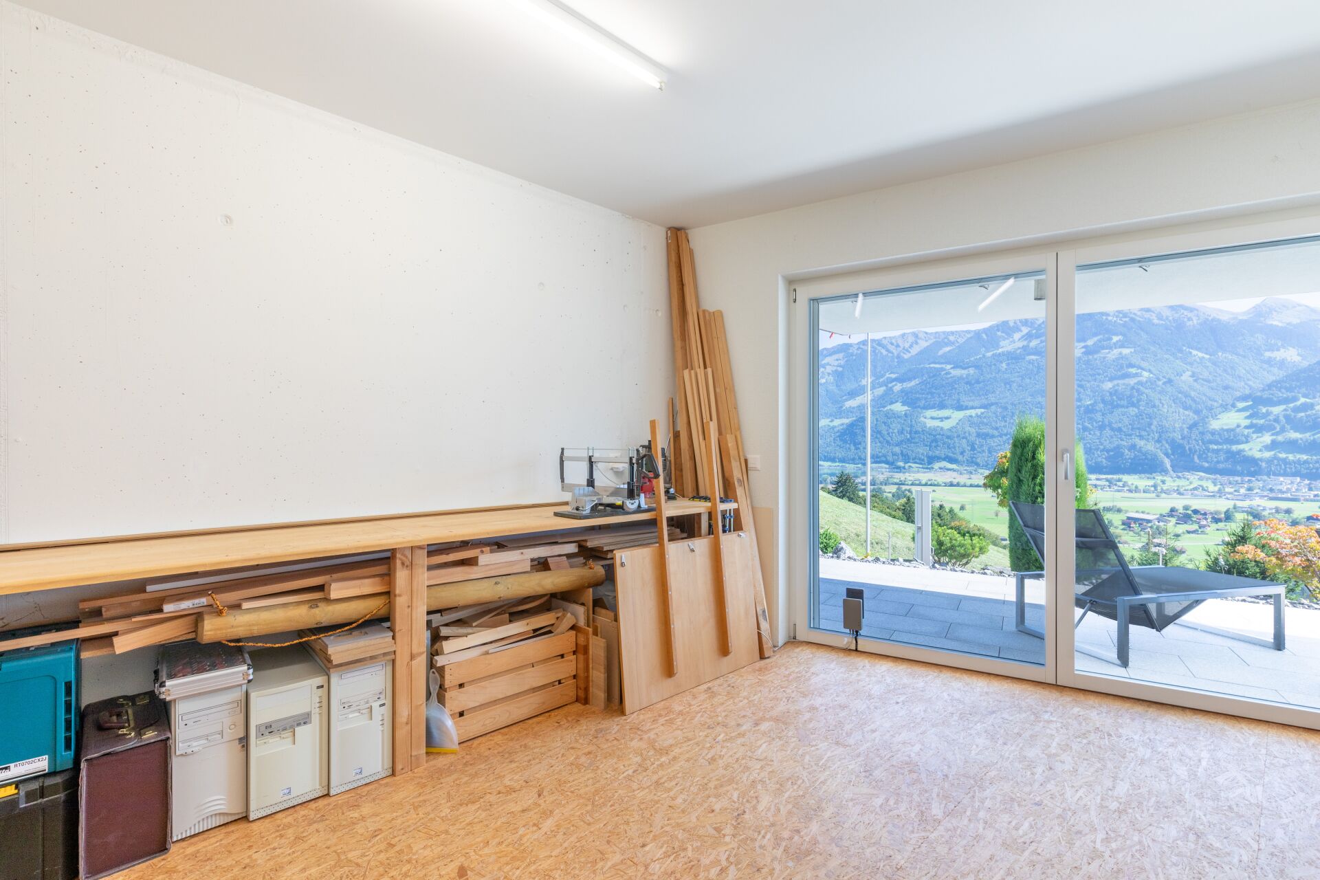 Im Untergeschoss befinden sich nebst den technischen Installationen die vorbereiteten Räumlichkeiten für eine mögliche Einliegerwohnung, die bei Bedarf eigenständig genutzt oder flexibel in das bestehende Raumkonzept integriert werden kann. Neben grosszügigen Nebenräumen bietet das Geschoss einen direkten Zugang zum überdachten Aussenbereich und Garten - ideal für individuelle Nutzungskonzepte wie Homeoffice, Hobby, Gäste oder private Rückzugsorte.