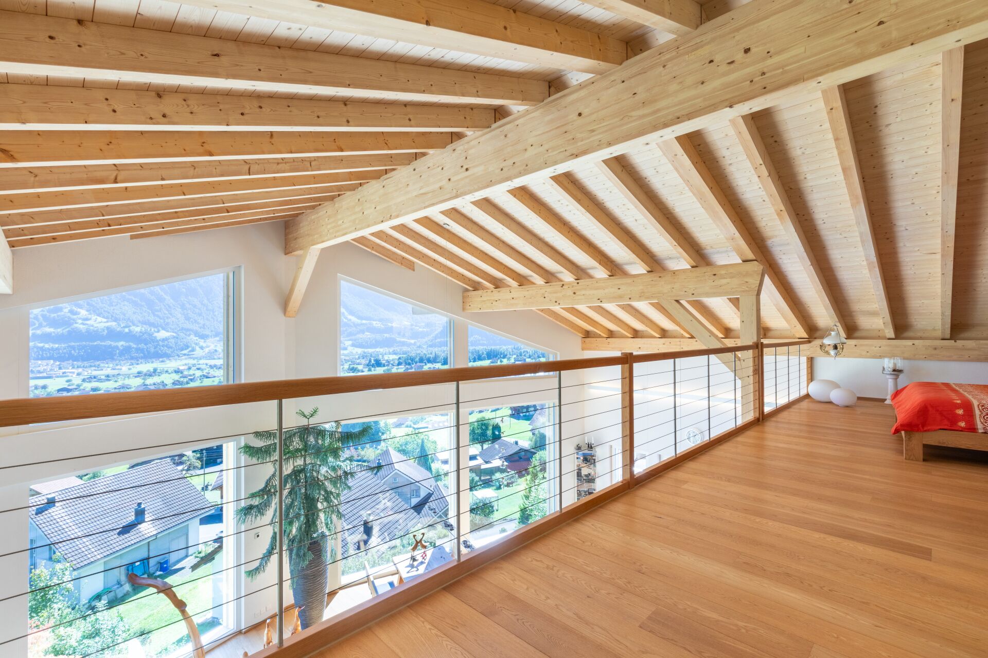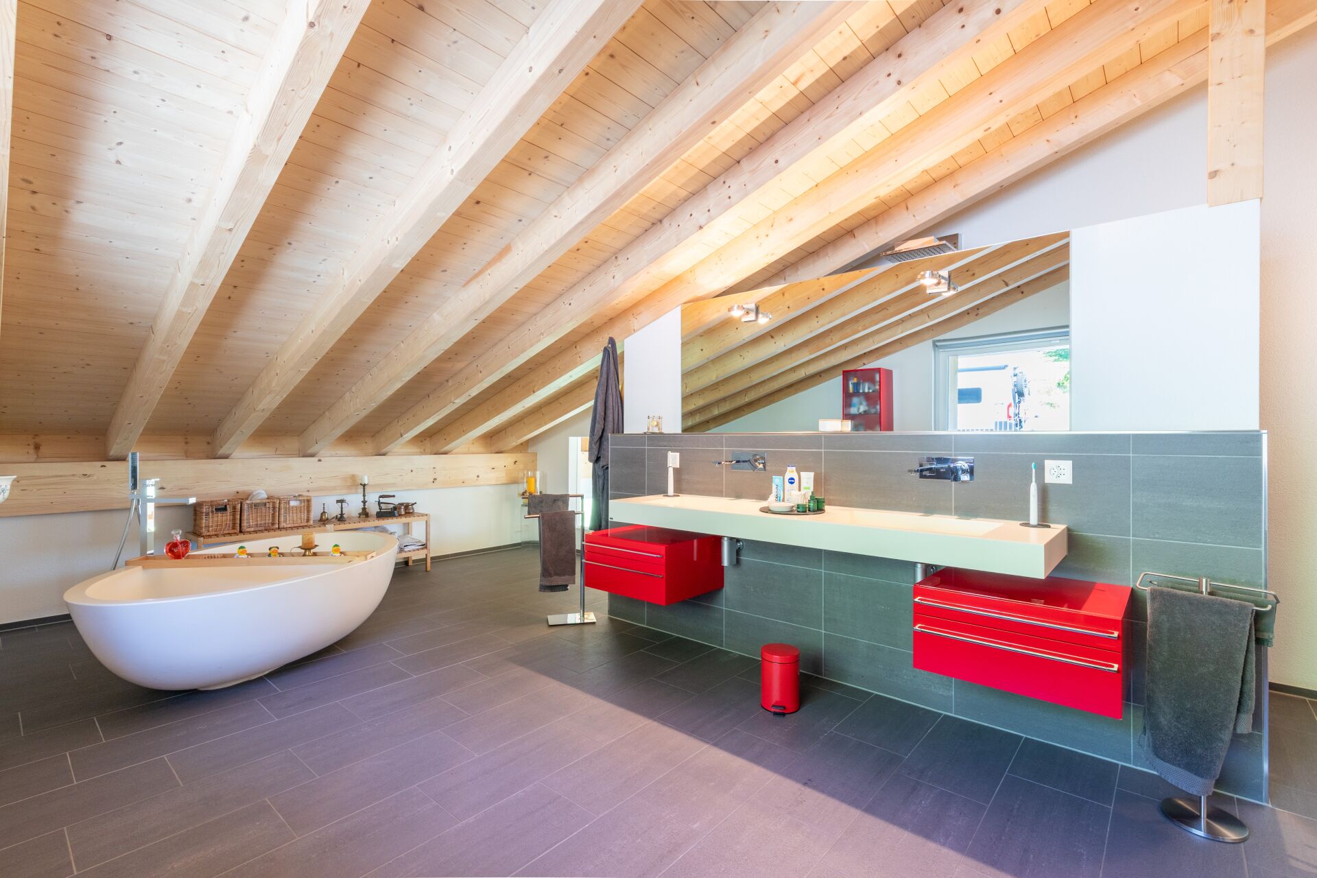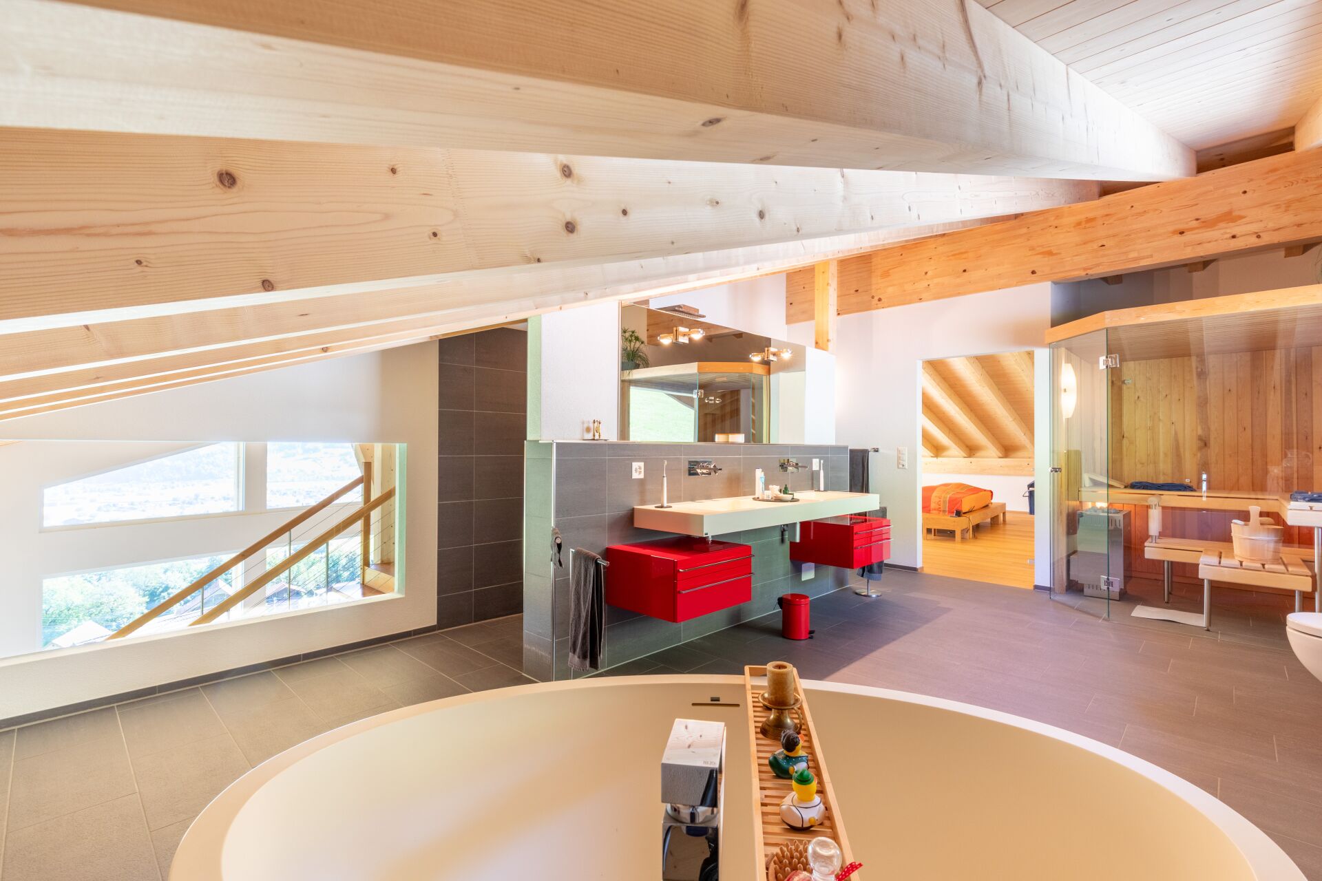 Über eine Treppe gelangt man auf die Galerie, wo sich der private Bereich befindet. Das offene Schlafzimmer mit begehbarem Schrank bietet viel Raum und Komfort. Das angrenzende, grosszügig gestaltete Badezimmer überzeugt mit erstklassiger Ausstattung: Eine freistehende Badewanne, eine offene Dusche, eine Sauna sowie stilvolle Design-Elemente schaffen eine exklusive Wellness-Atmosphäre und machen das Bad zu einem Ort der Entspannung und Erholung.